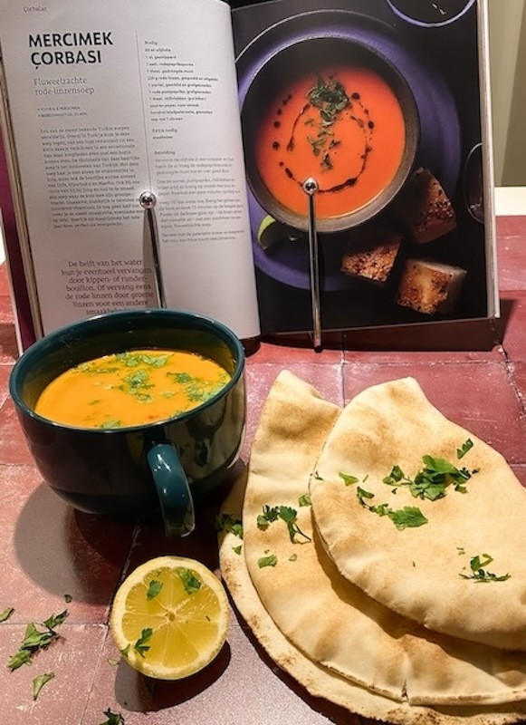Ik verheugde me er al een tijdje op om te gaan koken uit 'Het lekkerste uit Turkije'. Ik begon met de Rode-Linzensoep op pagina 38, een gerecht dat oorspronkelijk uit het zuidoosten van Turkije afkomstig is. De tekst belooft een smaakvolle, makkelijk te bereiden soep. En daar kan ik alvast duidelijk over zijn. Het is een heerlijke soep en niet ingewikkeld om te maken. Lekker met een Turks brood om erin te dopen.