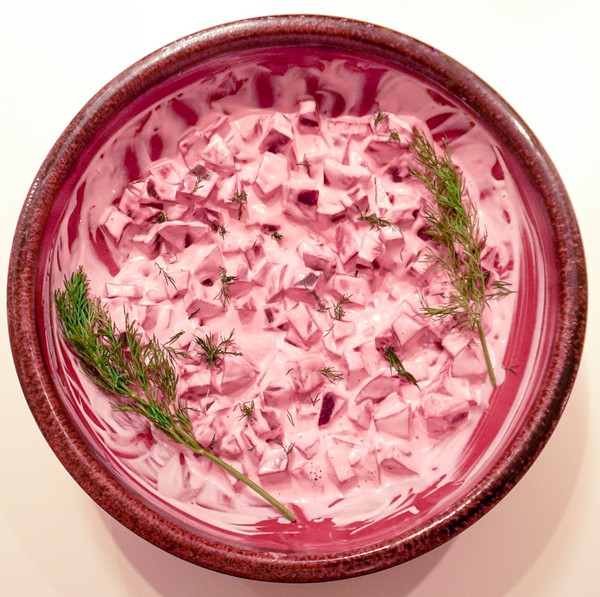 De ingelegde bietenpartjes snijd je in kleine stukjes en meng je vervolgens samen met een frisse groene appel met een dressing van mayonaise, mosterd en crème fraîche.