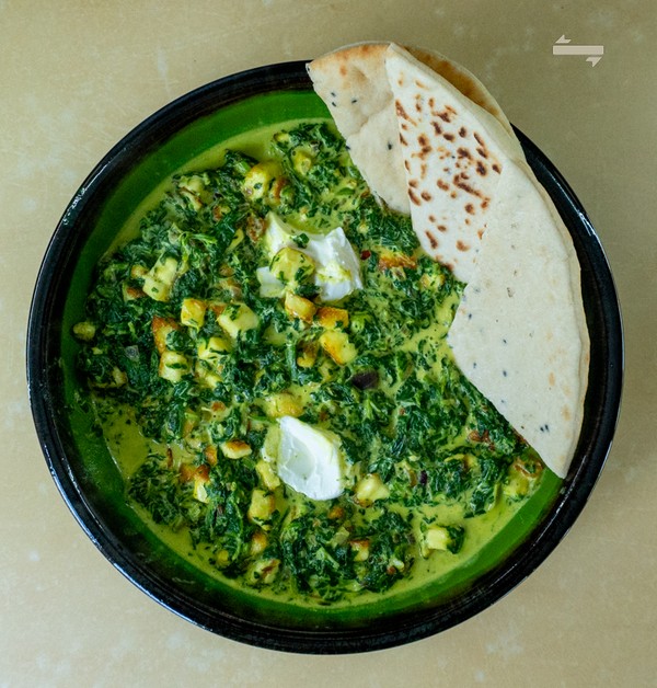 Paneer is niet in elke supermarkt te vinden, maar Halloumi zou vergelijkbaar moeten zijn en dit ligt wel in elke supermarkt. Die bak je dus in blokjes goudbruin, om daar vervolgens de currysaus met spinazie bij te doen.