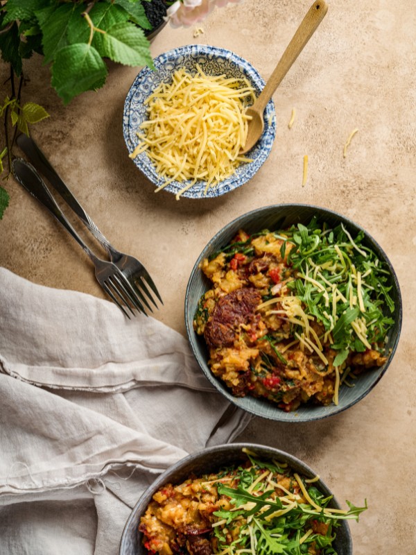 Stamp de aardappelen fijn met een aardappelstamper en schep de rucola en belegen kaas erdoor. Breng de stamppot op smaak met peper en zout.
